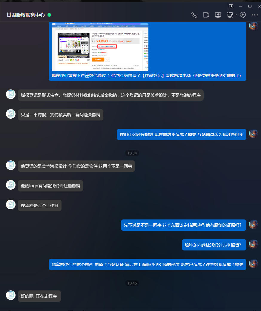 第一次发现您的倒卖行为时,我向互站举报,平台确实封禁了您的商品。今天心血来潮再次搜索,竟发现您死灰复燃,更换了链接继续销售我的程序!更过分的是,您居然还申请了作品登记,并通过了甘肃版权局的认证!搞得反而看起来你是正统,我才是可耻的倒卖者?真可谓厚颜无耻,登峰造极!