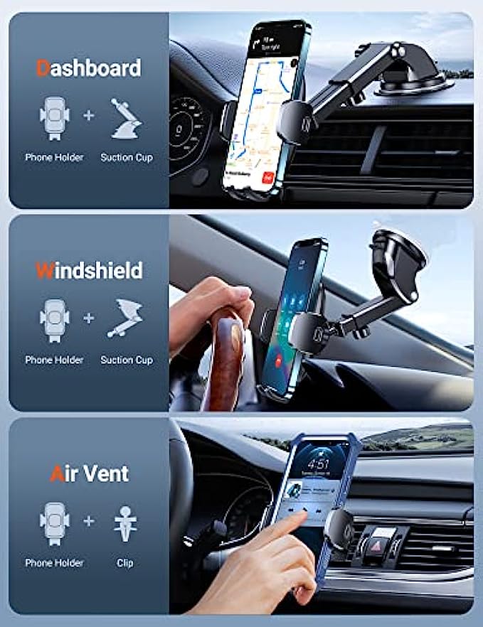 ▶[MILITARY GRADE STURDINESS TEST]: The 2022 enhanced TORRAS cell phone holder for car passed the military-grade sturdiness test! Absolutely sturdier 20 x than normal ones! The suction cup can withstand the temperature from -20℃(-4°F) to 95℃/(203°F), also be reusable! You can stick it on your car dash or windshield. Also, you can get a sticky pad to protect your car dash. Completely friendly, hands-free and views-adjustable! ▶[EASY&REAL HANDS-FREE]: Release easily with one button, clamp fast with one hand! ▶The car phone holder mount is suitable for all kinds of mobile phones with brand thick cases, Battery cases, Ring cases and it is exceptionally sturdy to hold your phone tightly. Like iPhone SE /11/ 11 Pro/11 Pro max /x/ xs max/xr/8 plus/8/7/6s plus, Samsung galaxy s21 /s20/s20+/s20 ultra 5G/note 20/10 plus/10/9 plus/9/s10/s9/a10e, Google Pixel 3a/4 XL, LG v20, One Plus and more. ▶[4 IN 1 ULTIMATE CAR MOUNT]: Are you not sure which installation method is better for your car? No worries! The 4 in1 phone mount for car can be flexible placement! Dashboard & Windshield & Air Vent & Home, all places work perfectly! Also, with low temperatures in winter and heat in summer, you can choose to avoid the issue caused by environmental influences. ▶[2022 ENHANCED VENT CLIP]: You can screw the nut to fix the clamp freely, the tighter you screw, the sturdier it will be! Its two small arms are just enough to press against the upper and lower vent blades to form a stable triangular structure and lighten the load on the middle one, with no damage to your car. This clip more than 10X sturdier than normal ones. It fits perfectly for your car no matter what the thicker blades vents or vertical ones. ▶[WHAT YOU GET]: TORRAS ensures you with an 36-month pleasant experience and top customer service. Please feel free to let us know if have any questions about this car phone mount. With the car holder for cell phone, you can get a package including 1 enhanced suction cup, 1 sticky pad, 1 strong air vent clip, and 1 user manual. Note: The sticky pad just can be used once, please think twice to stick it.